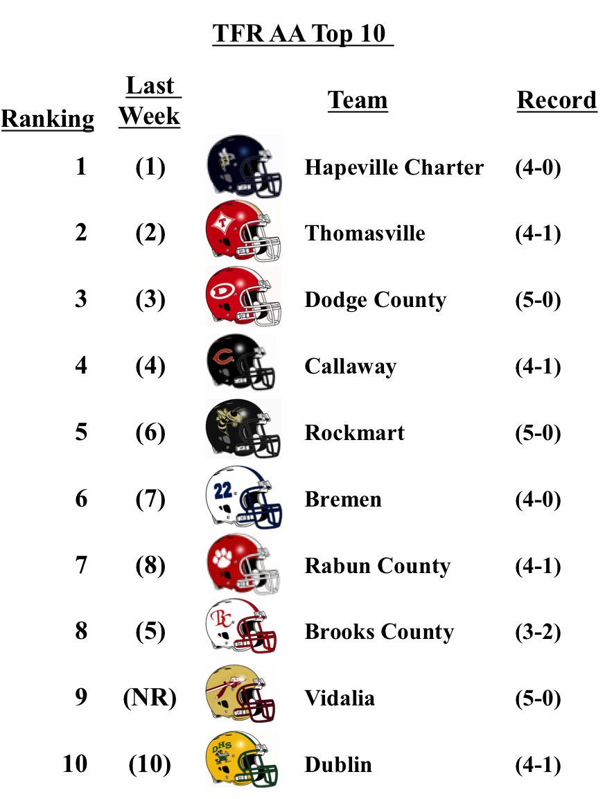 In Class 2A, Brooks County drops to No. 8 after getting shutout by TCC; while undefeated Vidalia debuts in the poll at No. 9 this week.
