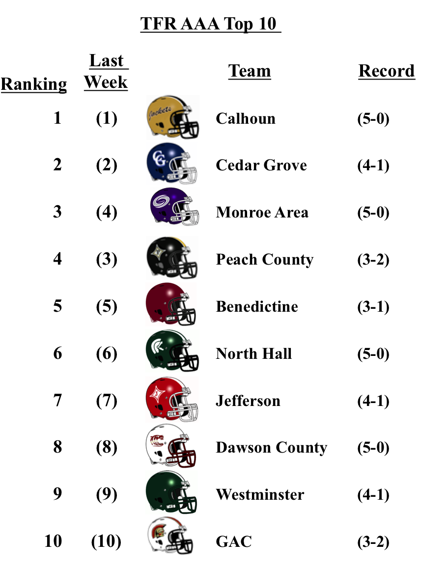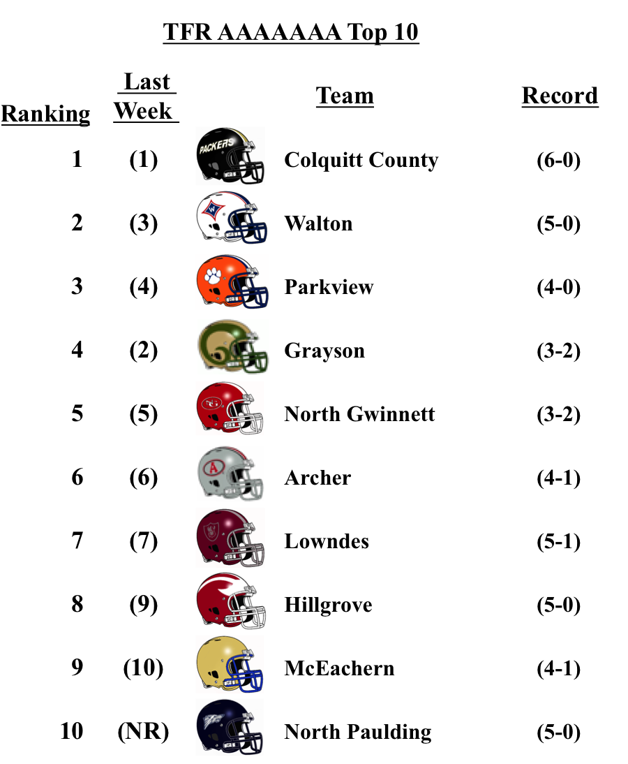 Colquitt heads up the 7A poll after defeating Grayson this past Friday. The Packers, have looked like the team to beat all season. North Forsyth debuts at No. 10 this week. The Walton Raiders and Parkview Panthers both move up one spot this week.