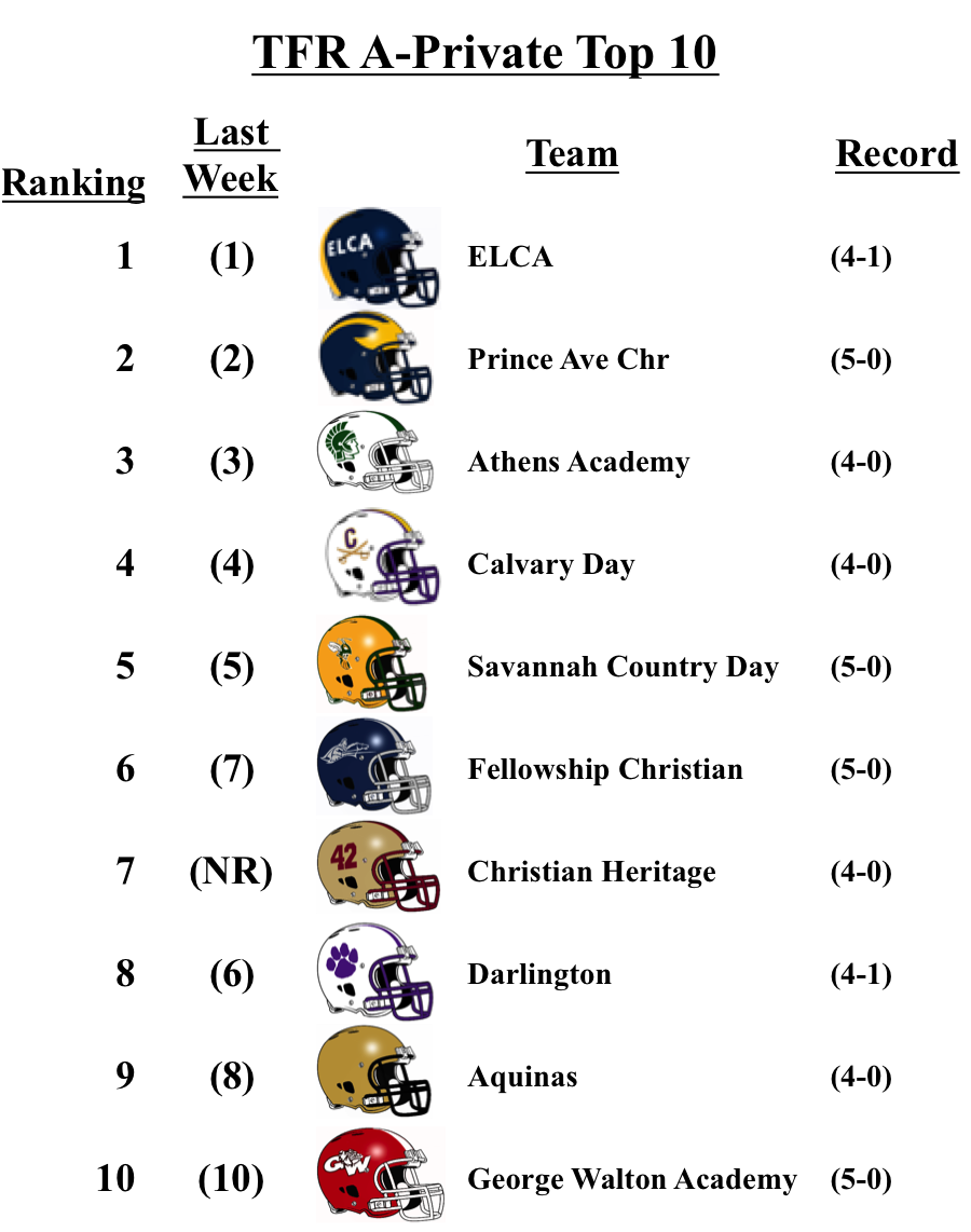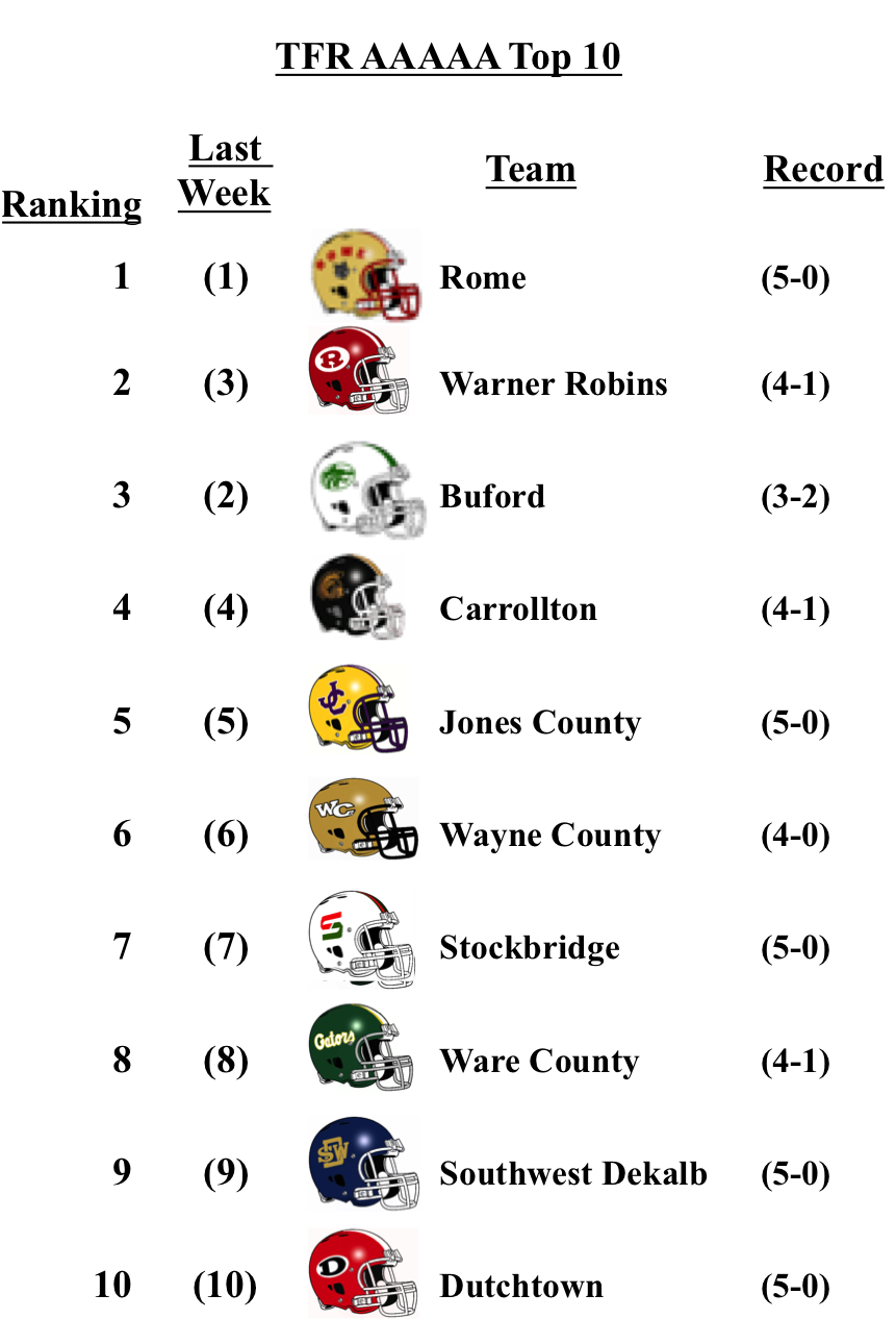 Warner Robins moves back up to No. 2 after Buford suffered a loss to 7A Archer. The remainder of the top 10 remains unchanged in 5A