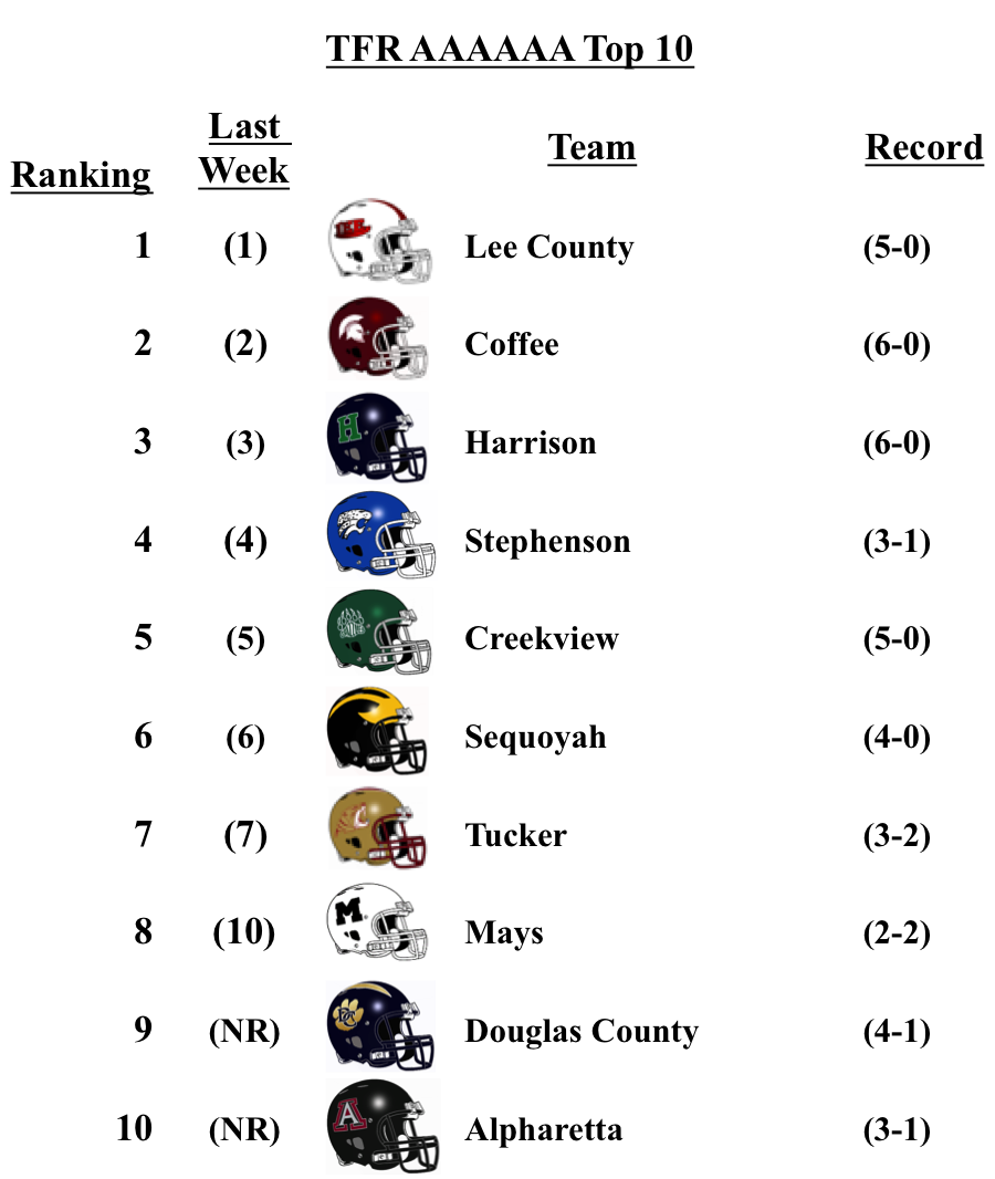 The top 7 in Class 6A remained unchanged this week. Mays jumps two spots after losses by Valdosta and NSWR dropped both teams from the poll; they are replaced by Douglas County and Alpharetta respectively this week.