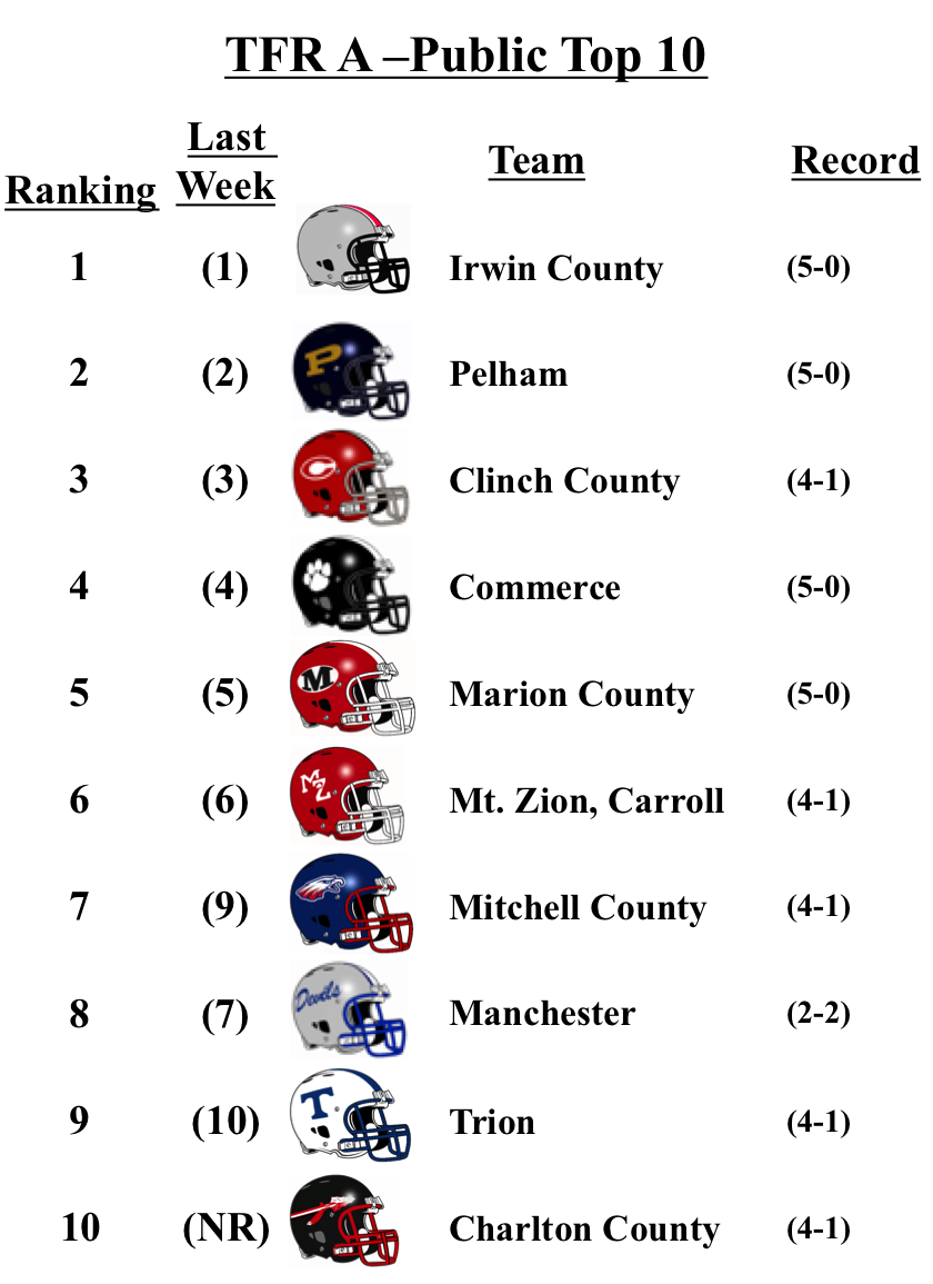 In 1A-Public, Mitchell County jumps to No. 7, after another Manchester loss. The Blue Devils are down to No. 8 after falling to 5th ranked Marion County. Charlton County claims the No. 10 spot after defeating Turner County on Friday.