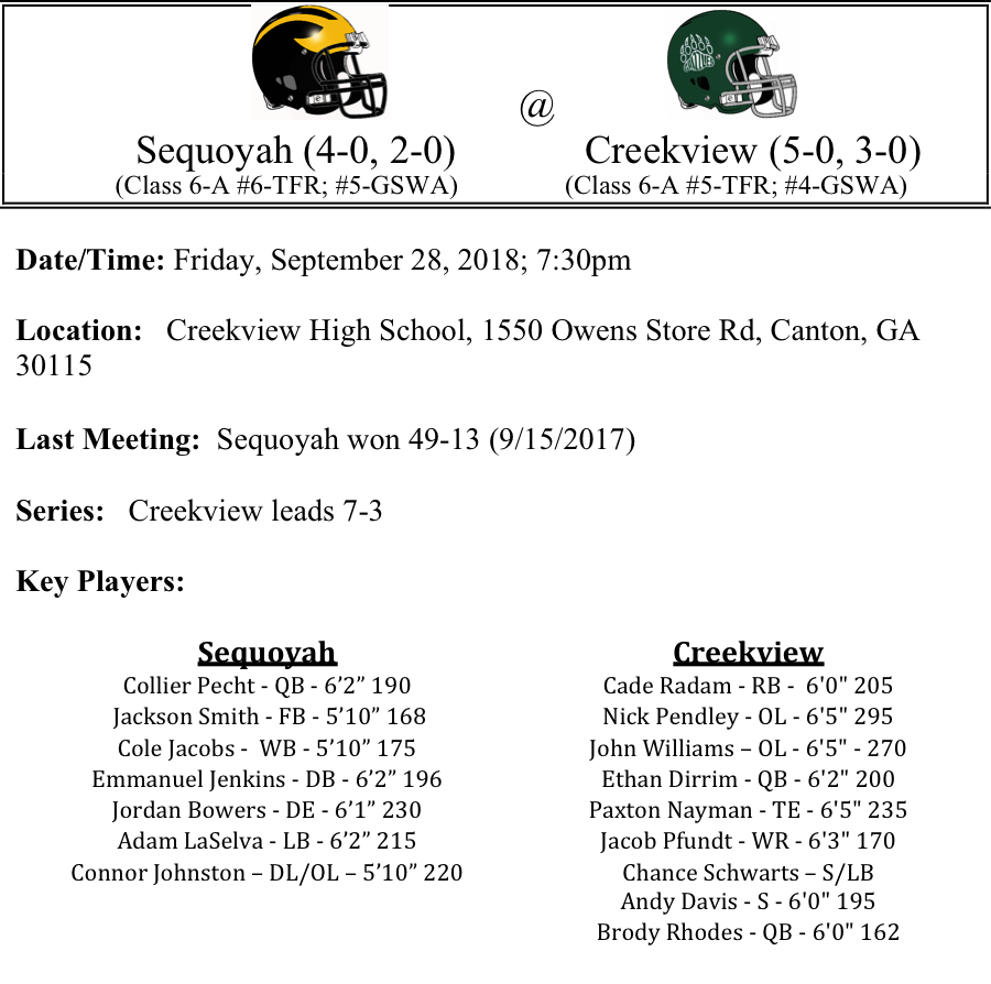 In case you missed it, here is a link to the podcast that we did previewing the Sequoyah-Creekview game with interviews from Coach Carter, Coach Teeter and Mick & Vern from the Cedarwood Tavern Cherokee County Pre & Post Game show: Creekview vs. Sequoyah Podcast