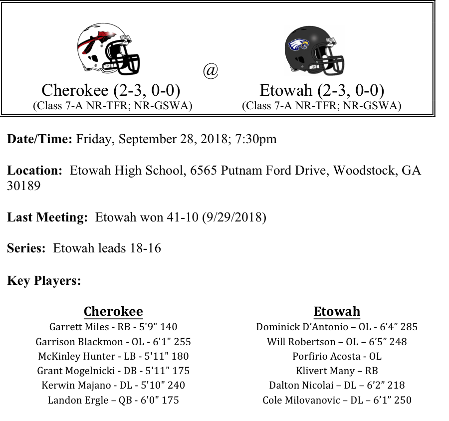 Cherokee County’s oldest rivalry will take place on Friday night at Etowah High School as the Cherokee Warriors visit the Etowah Eagles. Both teams come into the game with identical records this season. However, this week is the beginning of Region play, so these are the games that count most in region standings. The Warriors continue to grow into their own. The team has bolstered their rushing attack with the addition of Grant Mogelnicki to the backfield with Garrett Miles allowing for more options on offense. The two backs have combined for 419 yards rushing and 6-TDs. Landon Ergle continues to lead the county in passing with 871 yards and has a couple of young, but very talented wide receivers in Devin Ellison and Brady Bocherer. On defense, McKinley Hunter seems to always be flying around to the football. Keep an eye out for the athletic linebacker this week.