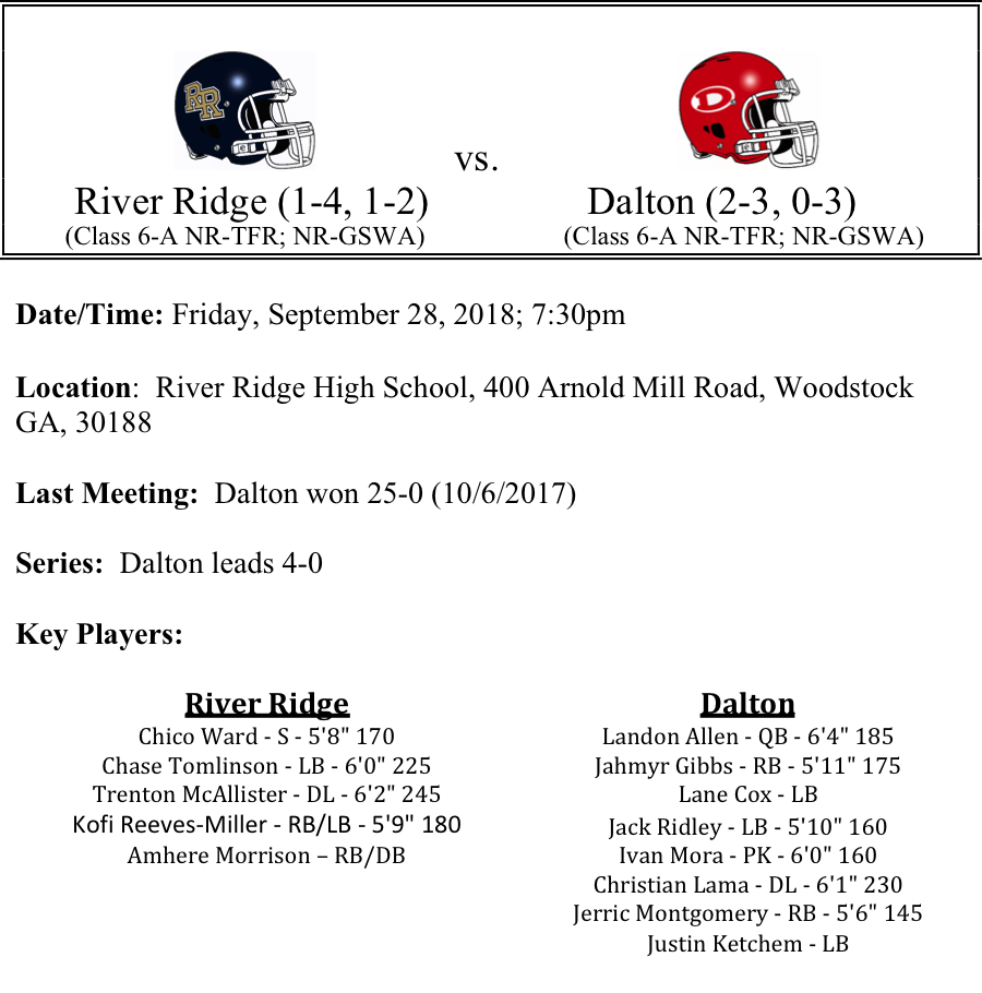 The River Ridge Knights will host the Dalton Catamounts on Friday looking to extend Dalton’s slow start in region play. Like the Knights, the Catamounts have run up against some stiff competition in the first part of the season. Some injuries have slowed the Cats as well. Dalton will lean on Landon Allen to direct a struggling Cats offense that is averaging 16 points in their last three games. Jamhyr Gibbs and Jeric Montgomery continue to pace Dalton on the ground, combining for 727 yards rushing and 7-TDs on the season.