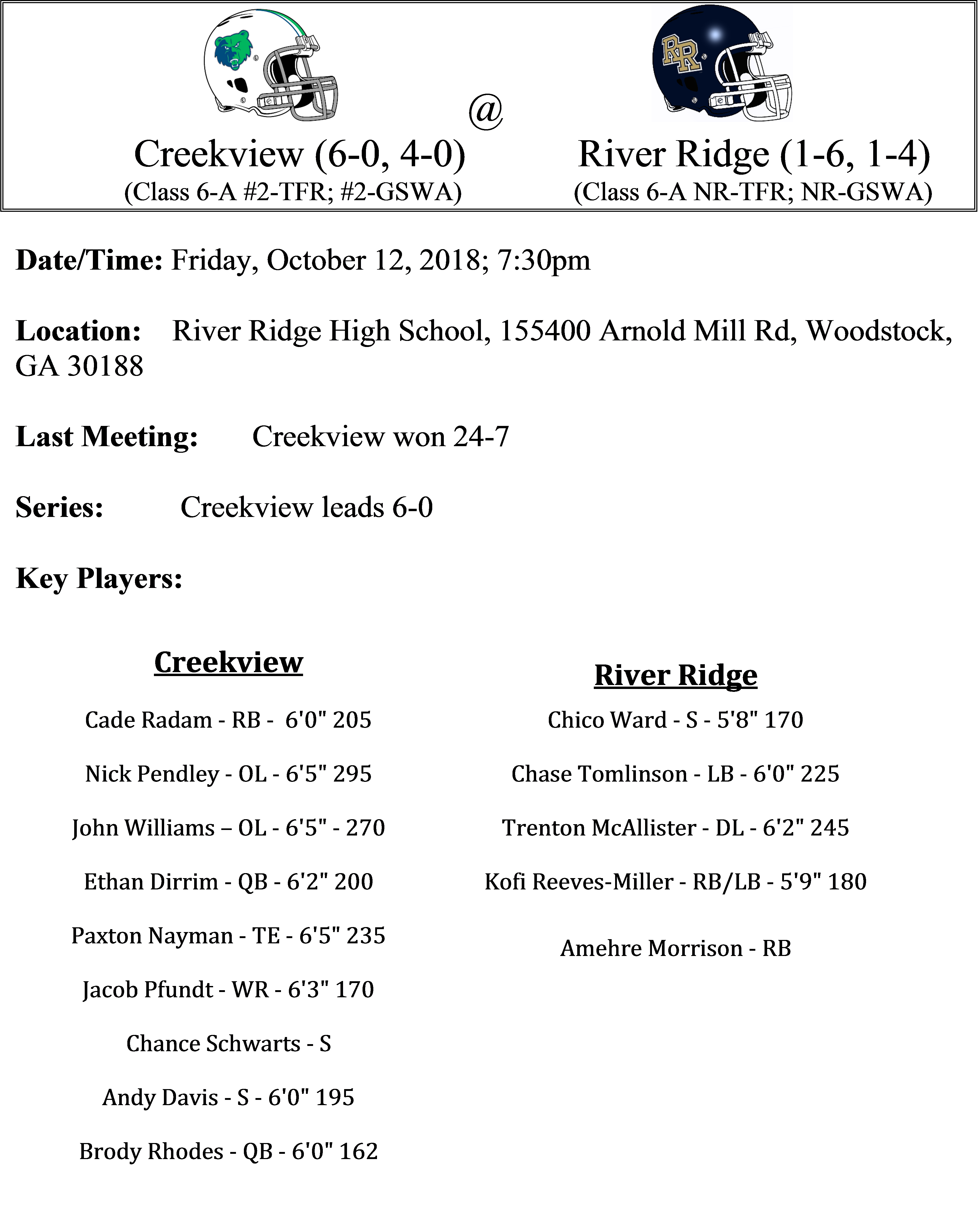 The Creekview Grizzlies had a week to rest after a hard-fought win last time out against rival Sequoyah. The Grizzlies garner the highest ranking for any Cherokee County football team, coming in at No. 2 in all major publications around the state. The Grizzlies defense will have to stop the run oriented River Ridge attack. Andy Davis has been great in run support from his safety position this season. The rest of the Grizzly defense is pretty darn good as well. Expect to hear the names of Potts, Schwartz, Rocks, Hanaford to name a few when Creekview is on defense. There is no surprise that the Grizzlies offense all starts up front with a very talented offensive line including names like Clenney, Taranto, Williams, and Pendley. These road-graders pave the way for Cade Radam who has 830 yards this season.