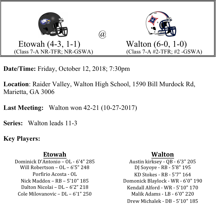 The Etowah Eagles will travel to Raider Valley to take on the No. 2 ranked team in the state, the Walton Raiders. The Raiders played without Austin Kirksey last week and outlasted rival Lassiter. Walton boasts plenty of star power, including running back DJ Soyoye and receivers Dominick Blaylock and Kendall Alford. We expect that Kirksey will be back this week and will be looking to add to his 941 yards and 6-TDs. The Raiders are only giving up 20.6 points per game and have picked up wins against Mill Creek and defending 7A state champion, North Gwinnett.