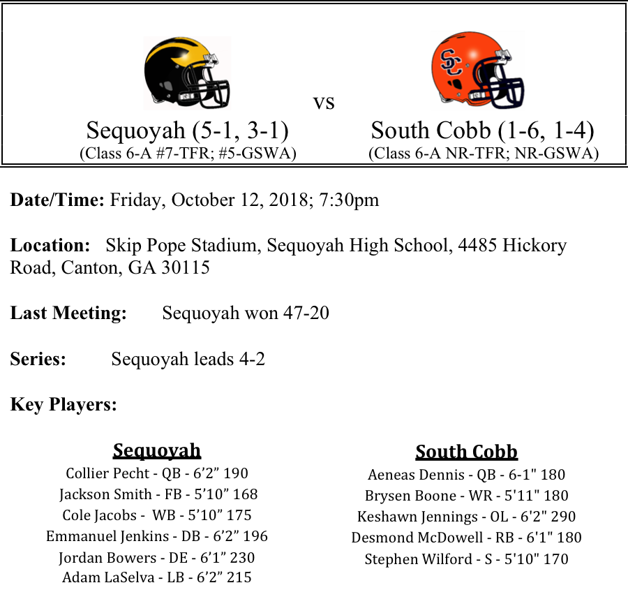 The Sequoyah Chiefs got back on track last week with a win against county and region rival River Ridge. The Chiefs played sound defensively last week and they will need more of that type of play this week as they host an athletic South Cobb football team. We know the usual suspects for Sequoyah, but the Chiefs have been getting some great play from Christian Hodgins, Connor Johnston, DJ King, Myles McGee and D’Angelo Smith. The running game and passing game were effective for the Chiefs last week against county foe River Ridge. We expect that South Cobb will see a steady dose of Cole Jacobs, DJ King and Jackson Smith.