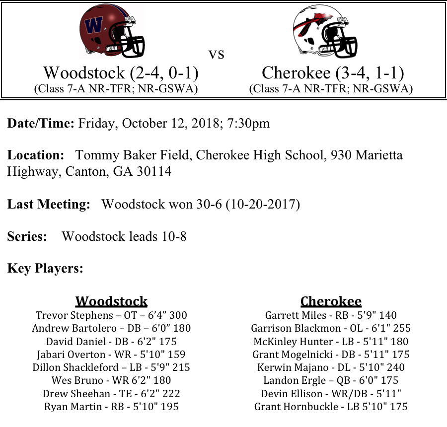 The Woodstock Wolverines travels to Tommy Baker field in search of their first region win as they take on the Cherokee Warriors. Woodstock welcomed back Ryan Martin last week, but will be playing with a new signal caller, Walker Ormsby the rest of the way. Last week, Martin rushed for 100 yards while Ormsby passed for 212 yards and 3-TDs. Sebastian Moss had a breakout game last week and is an additional weapon for Ormsby and the Wolverines. The Wolverines will need to tighten up a bit on defense as they face a much-improved Cherokee team this week.
