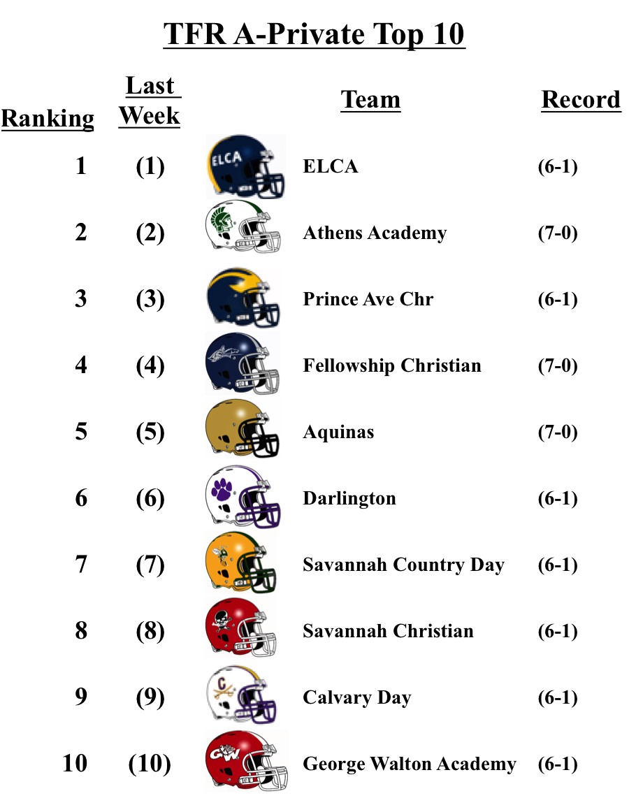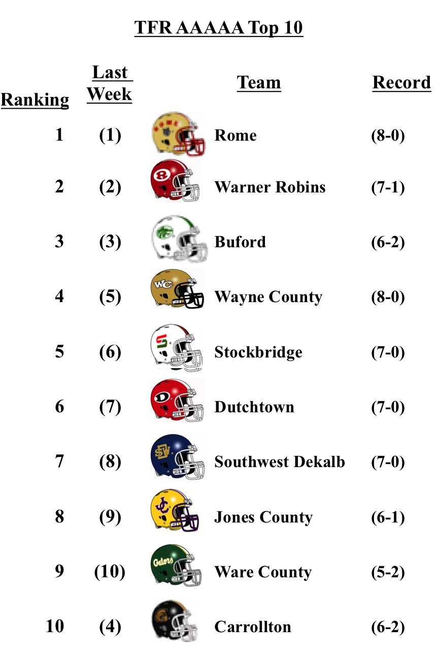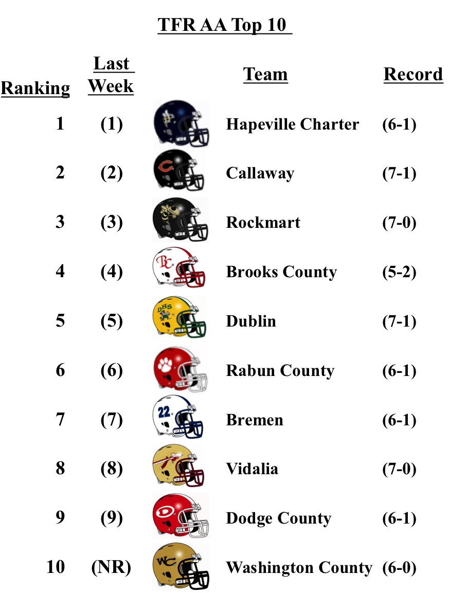While they didn’t play this week, Washington County debuts this week at No. 10. They’ll face No. 9 Dodge County on Monday. Hapeville Charter lost for the first time this season to 6A Allatoona, but the Hornets are still the No. 1 team in 2A.