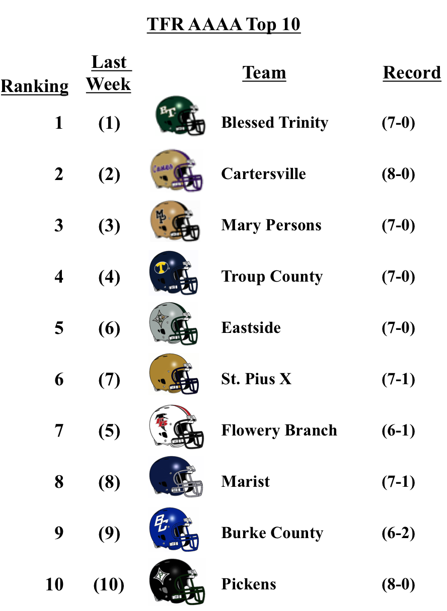 Flowery Branch dropped 2 spots after their 1-point overtime loss to No. 1 Blessed Trinity. The Falcons will have a chance to redeem themselves next week as they travel to No. 8 ranked Marist.