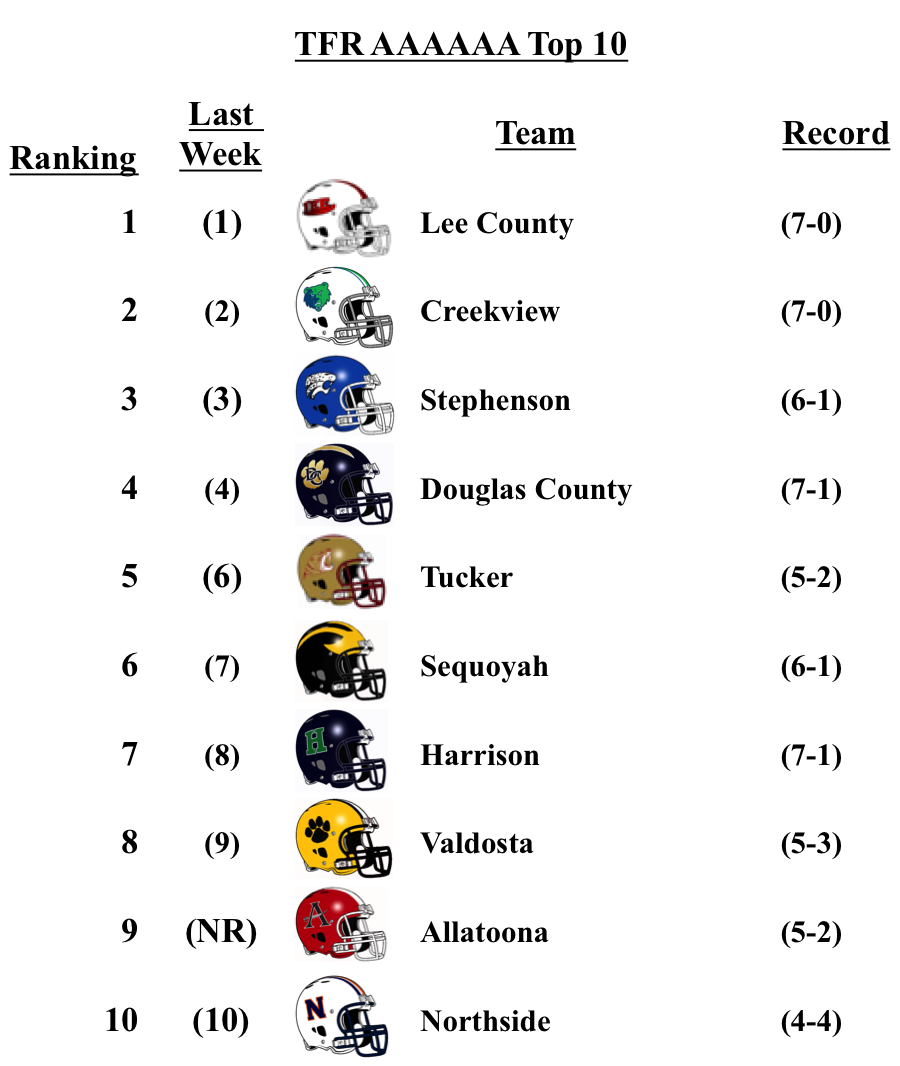 The only constant this season in Class 6A has been Lee County. The Trojans now sit at 7-0 after Saturday’s win over Northside Warner Robins. Allatoona is back into the poll after a big win over Hapeville Charter.