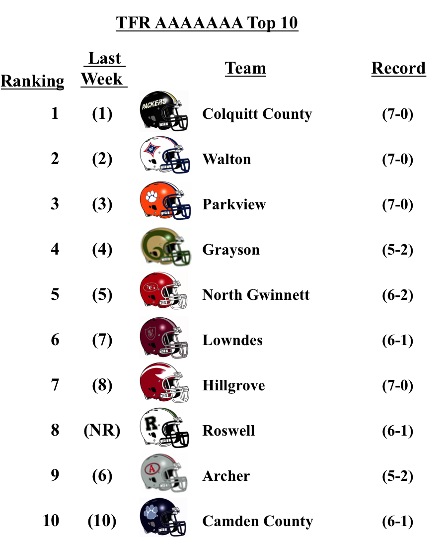 Roswell makes their debut into the Week-9 poll at No. 8 in class 7A. Down in South Georgia, all of the Region 1-A games were postponed due to the hurricane. The only top-10 matchup featured Grayson hosting Archer, which the Rams won going away. The loss dropped the Tigers to No. 9.