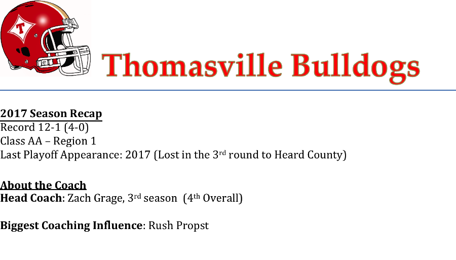 The Thomasville Bulldogs are a team that is steeped in Georgia high school football tradition. The Bulldogs have won 5 state titles in their storied history. Last season, Coach Zach Grage led Thomasville on their deepest playoff run in seven years. Coach Grage knows he and his staff have a couple of new challenges this season.