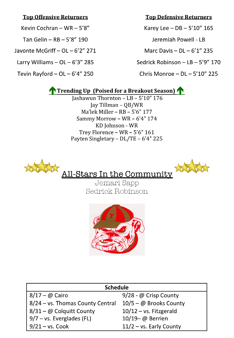 Chris Monroe joins Davis as an experienced lineman and Sedrick Robinson and Jeremiah Powell look to lead the linebackers. Jashawun Thornton (linebacker) and Payten Singletary (DL) are also projected to have an impact for Thomasville on defense.
