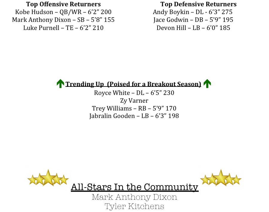 The Tigers defense will be led by another All-Region selection in Andy Boykin at defensive end. Boykin is a Power-5 caliber defense lineman that should provide valuable experience upfront for Troup. Royce White will join Boykin on the line making a very formidable duo for Coach Glisson.