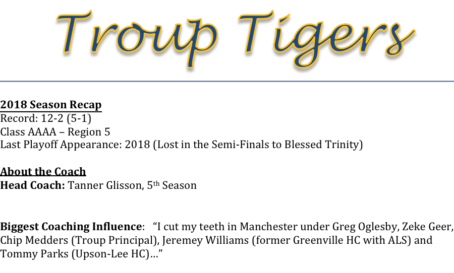 **Incase you missed it, you can check out our podcast interview with Coach Glisson here: Troup Tigers Podcast