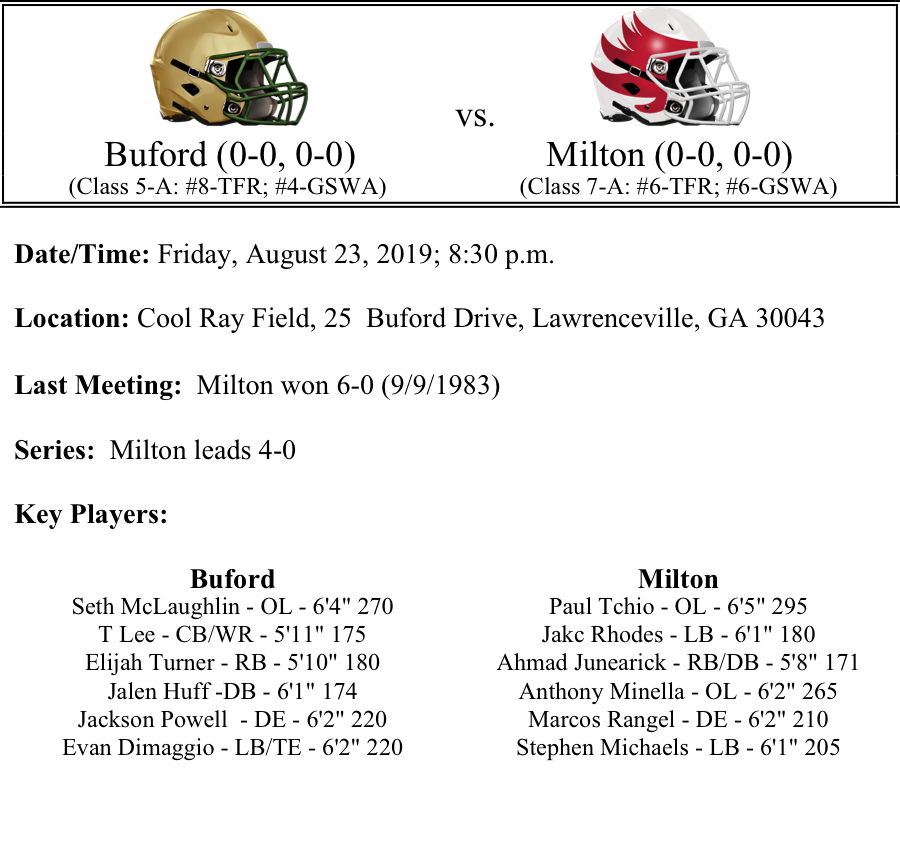Bryant Appling takes over as head coach for the Buford Wolves. Buford lost their starting quarterback from a season ago to transfer. Elijah Turner does return at running back while Seth McLaughlin will anchor the offensive line. Perhaps the most dynamic player for the Wolves is DB/WR T Lee. He will certainly make things difficult for the Milton passing attack.