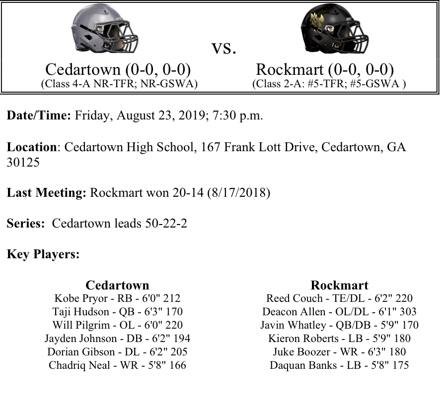 This Polk County rivalry will renew for the 75th time on Friday night as the Rockmart Yellow Jackets travel over to Cedartown to face the Bulldogs. Cedartown has dominated the series, but it was Rockmart getting the win last season. The Yellow Jackets will turn to Javin Whatley under center. Juke Boozer, last year’s hero for Rockmart is back at receiver. Reed Couch is also a receiving threat for Rockmart. Deacon Allen should make things difficult for the Cedartown ground game as he looks to clog up the interior defensive line.