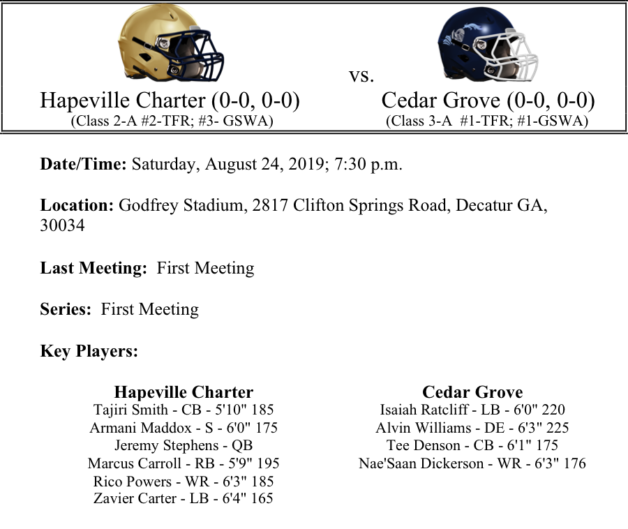 The Hapeville Charter Hornets and the Cedar Grove Saints will face off for the first time ever, this Saturday over at Buck Godfrey Stadium. Both of these teams have been at the top of their respective classifications for the past few seasons. The Hornets will be led by returning quarterback Jeremy Stephens, while Marcus Carroll, the teams leading rusher also returns. Newcomer Rico Powers should also be another weapon at receiver.