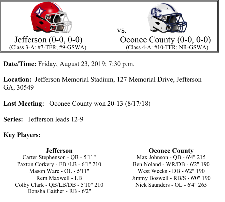 The Oconee County Warriors will travel to Jefferson on Friday to take on the Dragons. For the Warriors, all eyes will be on LSU commit, Max Johnson. Ben Noland was one of Johnson’s top targets last season and we expect for them to pick up where they left off. Jimmy Boswell also returns for Oconee County to add balance in the run game.