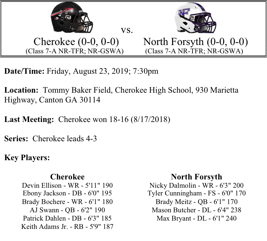 The Cherokee Warriors will host the North Forsyth Raiders on Friday at Tommy Baker field. The Warriors will have a new quarterback under center in sophomore A.J. Swann. Swann will have the luxury of having Cherokee’s two top receivers from a season ago, Devin Ellison and Brady Bocherer back for 2019. Keith Adams Jr. should get a bulk of the carries for the Warriors. Meanwhile, there was a lot of talent and leadership that graduated on the defensive side of the ball. Ebony Jackson and Patrick Dahlen will provide skill and leadership in the secondary for the Warriors, but who else we step up for the Warriors this season?