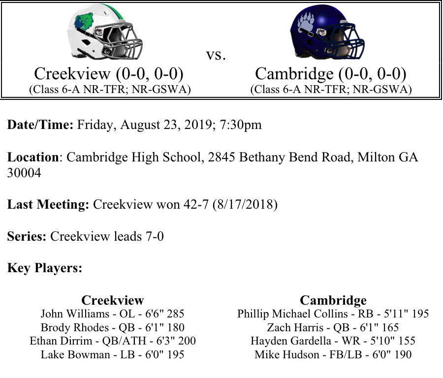 The Creekview Grizzlies will make the short trip over to Milton to face the Cambridge Bears. The Grizzlies have not lost in the series. New head coach Trevor Williams looks to have his team geared up as they looked impressive in their scrimmage against Cherokee last week. Brody Rhodes will lead the Grizzlies offense once again in 2019. Rhodes was the teams leading passer while splitting time with Ethan Dirrim. The duo passed for over 1,400 yards last season. Clemson commit, “Big” John Williams will anchor the offensive line. Lake Bowman is the Grizzlies leading returning tackler from a year ago.