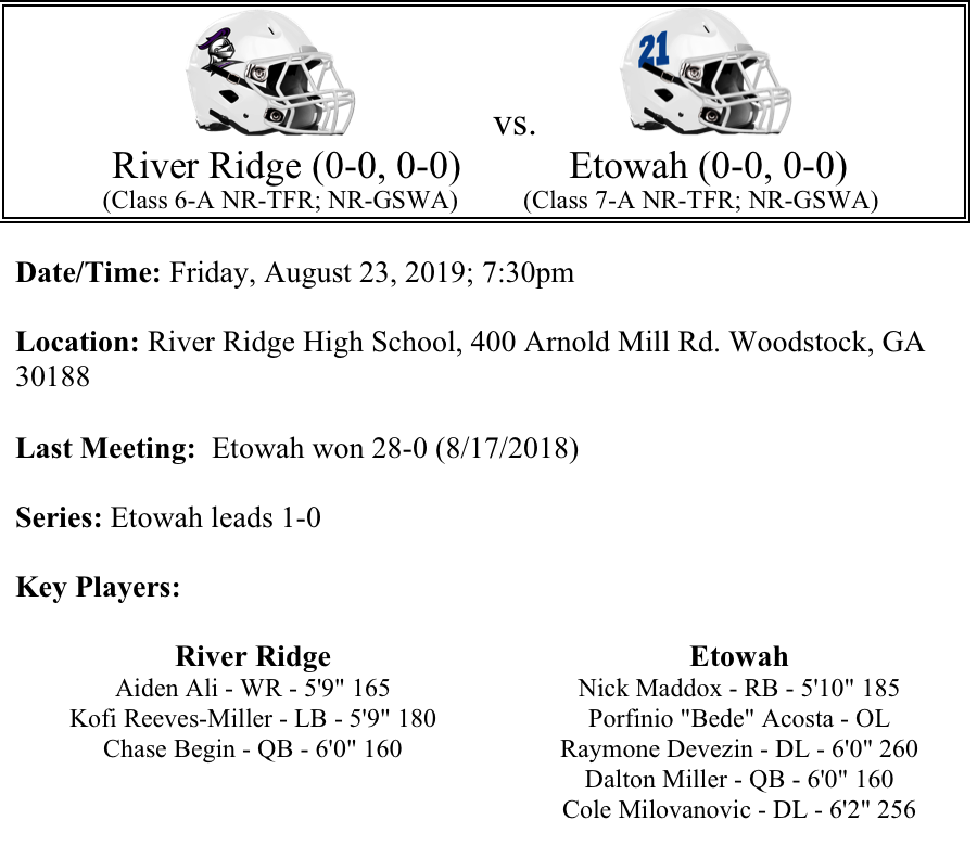 The River Ridge Knights will start the Mike Collins era on Friday night as they host the Etowah Eagles. The Knights had a good showing in their scrimmage last week and are looking for their first win over a County rival in program history. We expect for Kofi Reeves-Miller and Ahmere Morrison to share the load at running back to help ease Chase Begin return at quarterback. Begin is a threat to pass and has shown an ability to scramble, so we know he will keep the Etowah defense on their toes. Aiden Ali should be one of his primary targets through the air.