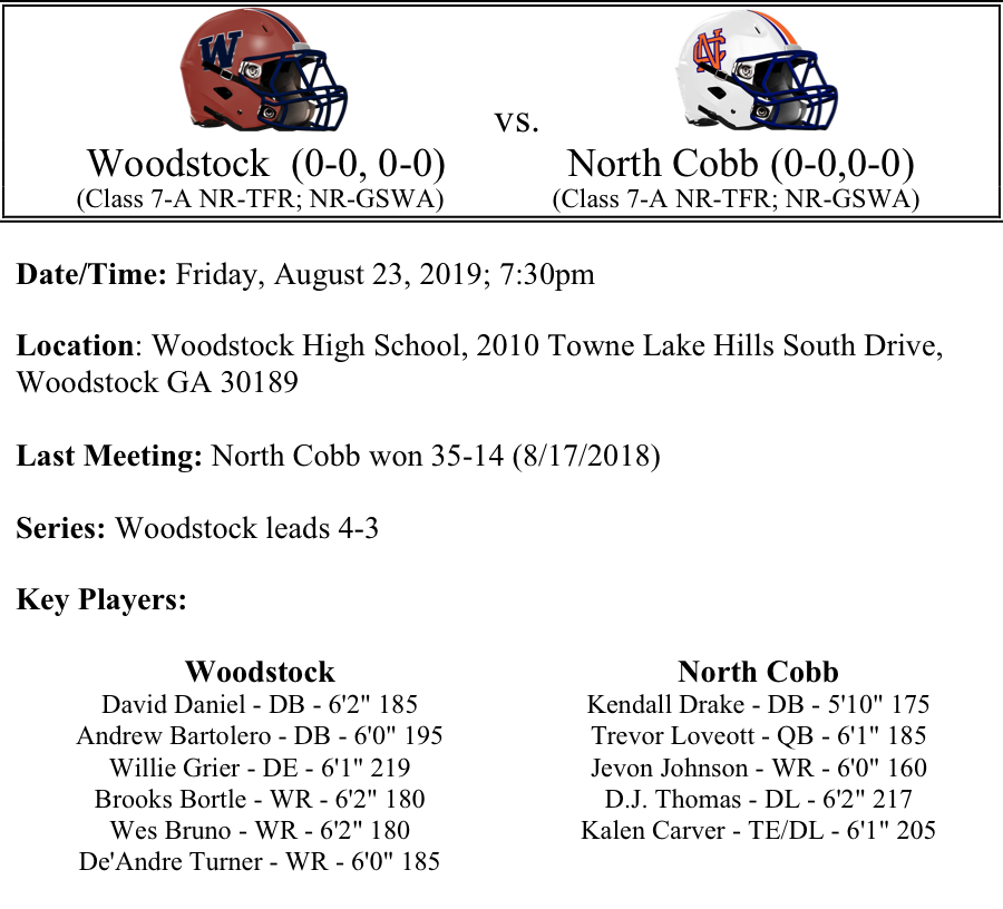 High school Football is finally back in Cherokee County! This week we continue our Cherokee County Football game previews. Our matchups in Week-1 are Woodstock vs. North Cobb, River Ridge vs. Etowah, Creekview vs. Cambridge and Cherokee vs. North Forsyth. Sequoyah is off this week. Thanks for reading. Please make sure to get out and support these young men on Friday night. As always comments and discussion are welcome!
