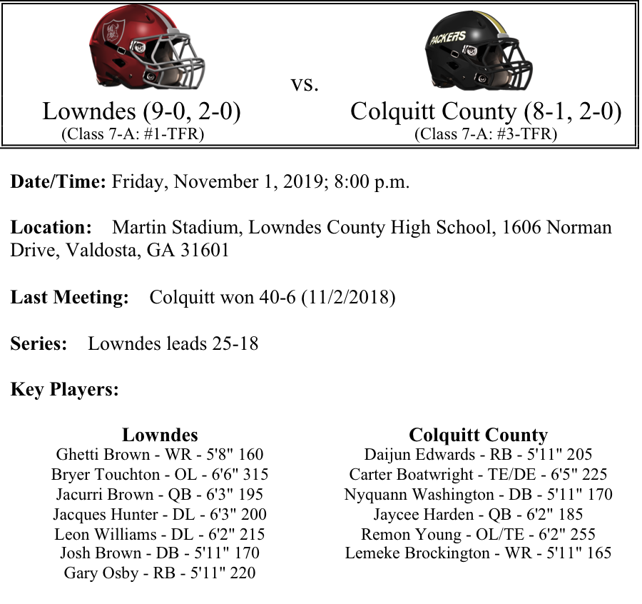 This is Part I of our GHSA Football Previews called Eight Greats Around The State. Several games this week will help determine playoff seeding. Our first preview features a big show down in Region 2-3A as the Pierce County Bears host the Appling County Pirates. Pierce is looking for their second consecutive region title, but Coach Tomberlin has the Pirates playing well. So, who’s rushing attack will reign supreme Friday night? In Region 3-5A, the Riverdale Raiders host the Starr’s Mill Panthers. The Raiders only loss is a 13-point setback to highly ranked Carrollton. But Starr’s Mill has won the last three region titles and looks like they aren’t quite ready to release their stranglehold on the region. Another big game for seeding takes place in Region 3-7A as Marietta takes on Hillgrove. Both of these teams were edged by McEachern, but a win this week by either team would help secure at least a first round home playoff game. Finally, Region 1-7A comes down to a matchup between Lowndes and Colquitt County. Since 2014 Colquitt has won the region all but one time and that was in 2017, when the Vikings claimed the Region title. Will the Packers air assault or the Vikings ground game rule the night in this matchup? As always, please feel free to share and comment.
