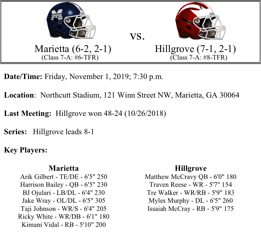 As it stands right now, this game does not have region title implications, assuming McEachern remains undefeated. However, a home playoff game could be at stake when the Marietta Blue Devils host the Hillgrove Hawks this Friday. The Blue Devils have a star-studded offense that is led by quarterback Harrison Bailey (2,314 yards passing, 23-TDs), tight end Arik Gilbert (48 receptions, 925 yards 8-TDs), receiver Ricky White (46 receptions, 677 yards, 8-TDs) and running back Kimani Vidal (734 yards, 15-TDs). The defense is allowing 20.2 points per game. B.J. Ojulari leads the way on defense with 75 total tackles and 12 sacks.