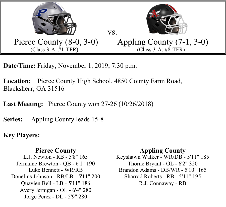 The Appling County Pirates are off to their best start since 2011. Coach Rick Tomberlin has the Pirates in a position to compete for a region title if they can win their last two games. As a team, Appling County has racked up 2,284 yards rushing. Sharrod Roberts (536 yards, 7-TDs) and R.J. Conaway (465 yards, 6-TDs) lead the ground attack. Keyshawn Walker and Matthew Nails have combined for 14 receptions for 311 yards and 4-TDs. The Pirates are only allowing 10.3 points per game this season and have two shutouts. We believe Pierce survives a scare from Appling this week. Bears by 2.