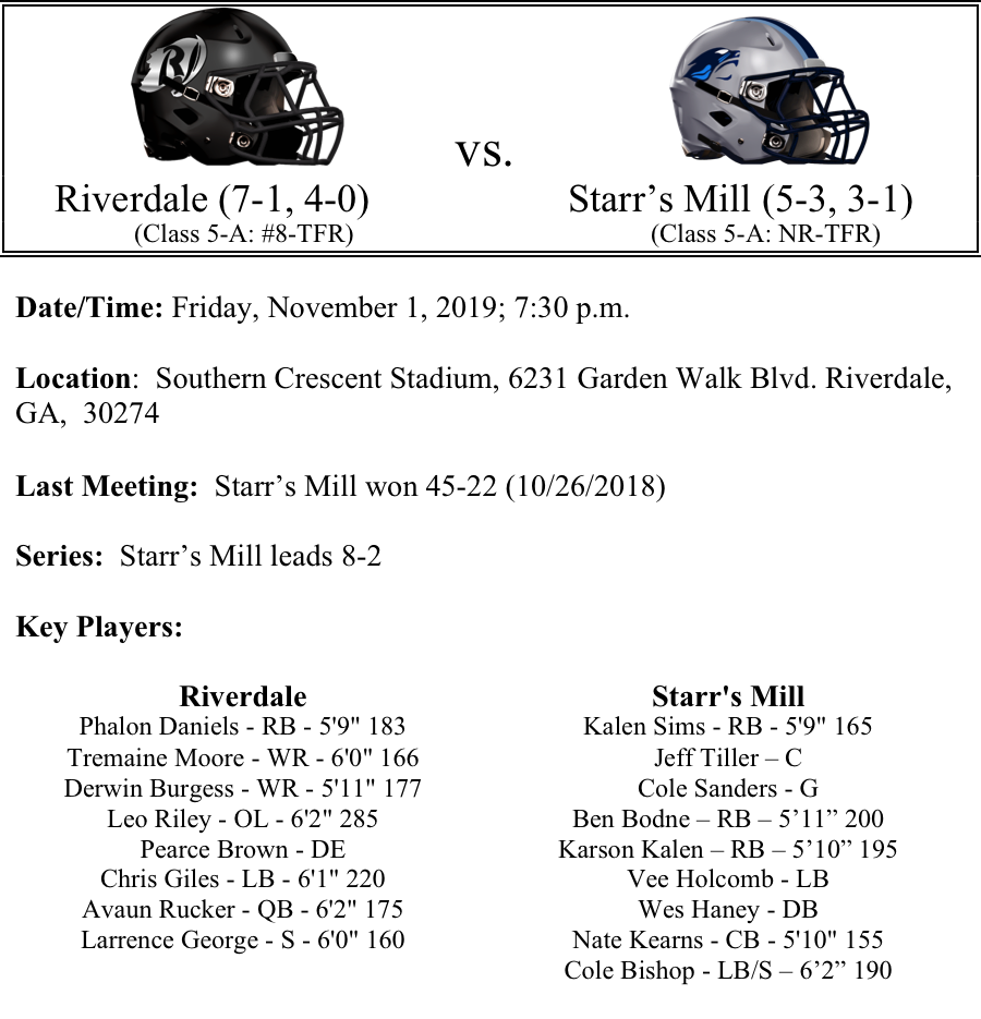 The Starr’s Mill Panthers have won the last three region titles, but will need to win out in order to claim their 4th consecutive title. The Panthers will look to get their ground game going this week. Kalen Sims (784 yards, 4-TDs) and Ben Bodne (646 yards, 12-TDs) lead the way for the Panthers who have rushed for 2,071 yards as a team. Starr’s Mill has only passed for 331 yards this season. The Starr’s Mill defense is allowing 12.8 points per game and has two shutouts to their credit. This game should be much closer than last hears 23-point Starr’s Mill victory…but we still like the Panthers by 8 this week.
