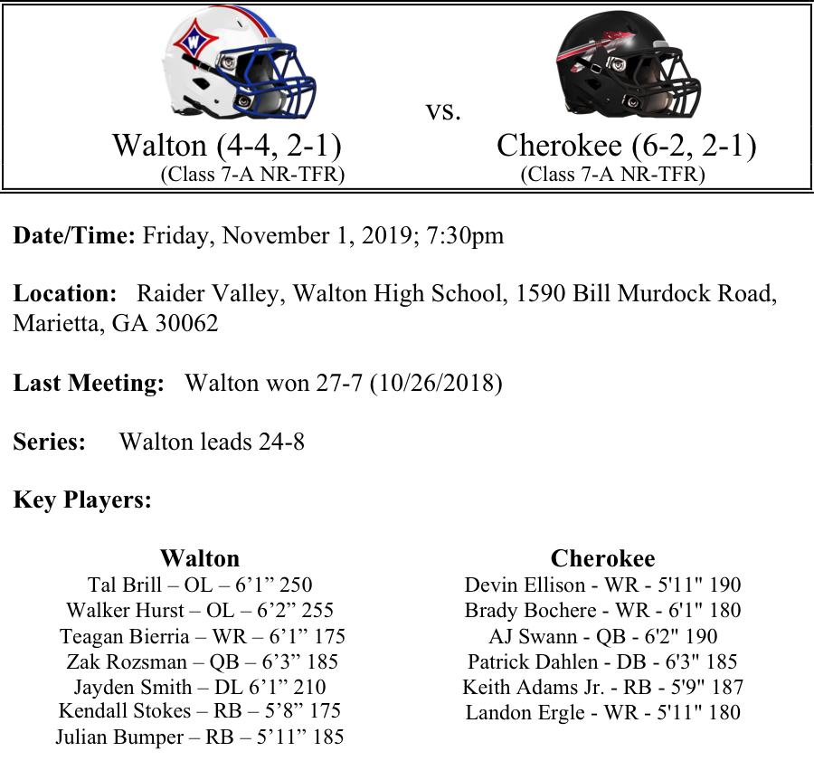 The Walton Raiders host the Cherokee Warriors this Friday night. Both teams are sitting in a four-way tie for 1st place. We won’t even begin to try to breakdown the scenarios here, but we do know that a win this week would almost guaranty a home playoff game for either team. Last week, Kenny Djaha was the workhouse for Walton as he rushed for 150 yards. Djaha, Julian Bumper and K.D. Stokes have made for a formidable rushing attack for the Raiders. Quarterback Zak Rozsman had the Raiders only score last week, but he has shown in recent weeks that he can make several throws. Teagan Bierra is one of his top targets.