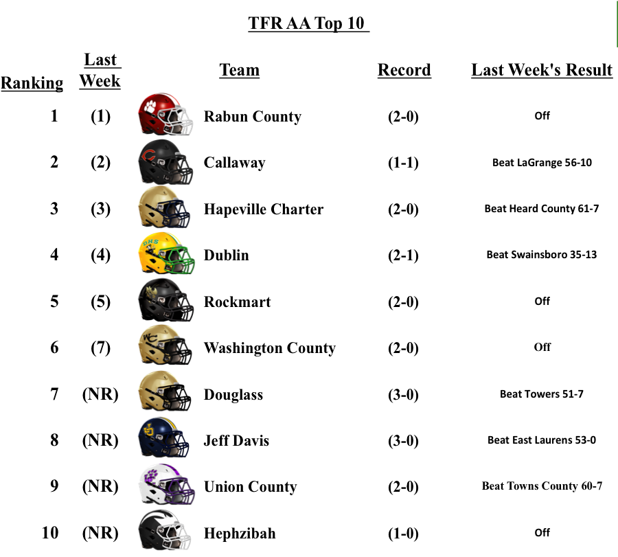 The surprise of the weekend might have occurred down in Ft. Valley as traditional 3A power Peach County knocked off the two-time 6A State Champion, Lee County, 40-17. In other Top-10 action, Allatoona downed Creekview 37-7. The loss drops the Grizzlies from the poll and Richmond Hill replaces them at No. 10.