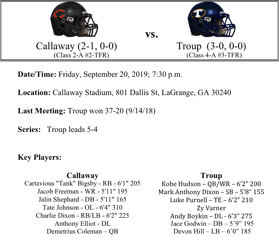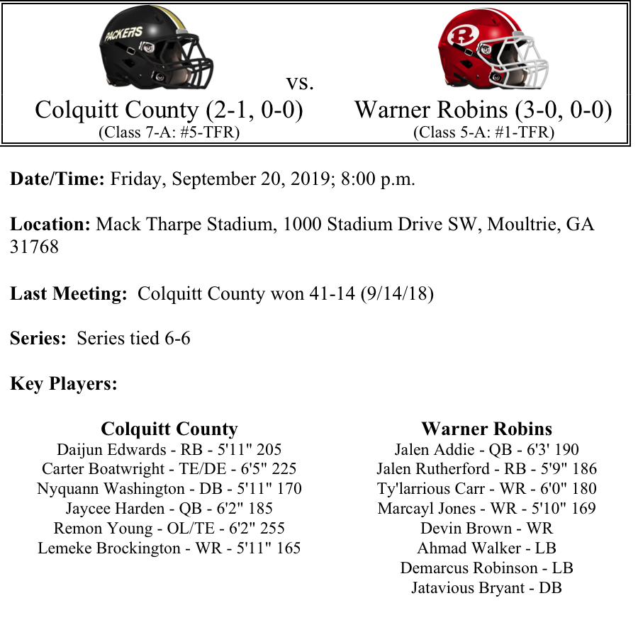 This is Part II of our Week-5 GHSA Football Previews. First up, another rivalry game as the Callaway Cavaliers take on the Troup Tigers down in LaGrange. Both teams are extremely talented across the board. These teams have the potential to really light up the scoreboard. Our next preview features a rematch of the 2017 & 2018 Class A-Public state title game, as region rivals Irwin and Clinch clash this week. We expect the winner of this game to go on to win the region. But the last two seasons, it was Clinch that captured the coveted state title. Colquitt County will look to rebound after last weeks heartbreaker to Valdosta, but Warner Robins won’t make it easy. Do the Demons have enough to knock of the 7A power? Finally…we preview another Region 6 Class A matchup as North Cobb Christian visits Trion in a battle of two Top-10 teams. As always, thank you for reading…please feel free to share and comment.