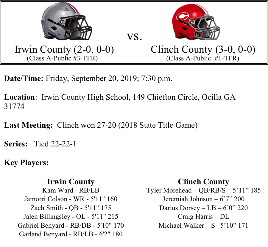 Irwin County and Clinch County have met for the state title in 2017 & 2018 and once before in 2015. The Irwin County Indians have been playing without their star fullback, D.J. Lundy, but have not seemed to miss a beat. Gabriel Benyard has shown his explosiveness with the ability to make defenders miss while Kam Ward regularly breaks through arm tackles and exhibits a balance of both power and speed. Garland Benyard and Jamorri Colson have also contributed to the Irwin County rushing attack. The Irwin County defense is only surrendering 7.5 points per game. The Indians game last week was cancelled due to weather so we will see if that has any impact on them this week.