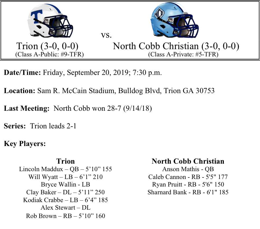 The Trion Bulldogs will host the North Cobb Christian Eagles this Friday night at McCain Stadium. There were several questions that Coach Brown had about his 2019 Bulldogs coming in to the 2019 season. So far the seemed to have been up to the task. The Trion defense is allowing just under 9 points per game. Leaders on the defense include names like Wallin, Baker, Wyatt, Crabbe and Stewart. Meanwhile, Lincoln Maddox continues to direct the Trion offense at quarterback and Rob Brown seems to be fitting in nicely to the offense as well. Trion is averaging just over 31 points per game.