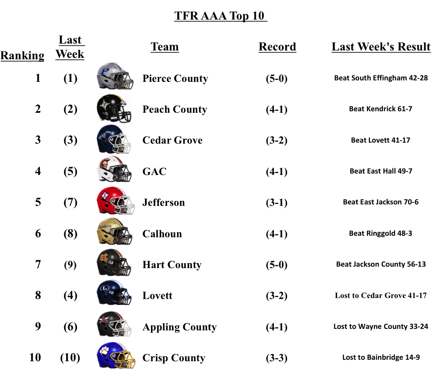There were no new entrants into the 3A poll, although there was some shake up. Cedar Gove took control of Region 5 with a big win over Lovett. Meanwhile Appling County fell to 5A Wayne County. Those losses dropped Lovett to No. 8 and Appling to No. 9. Crisp County holds at No. 10 after losing by 5 to defending 5A State Champs, Bainbridge.