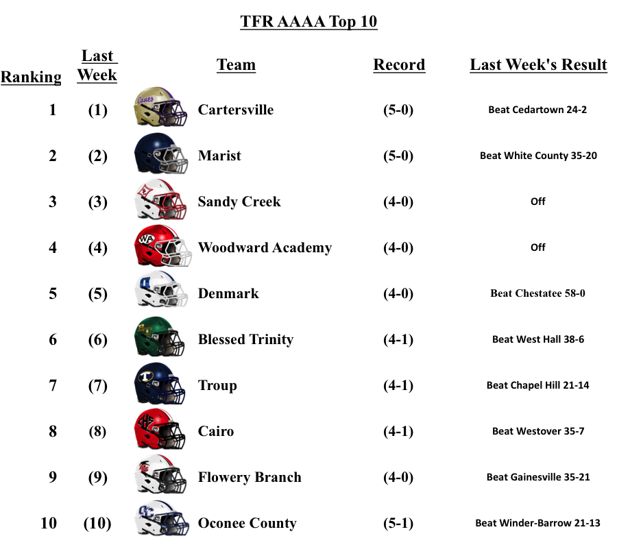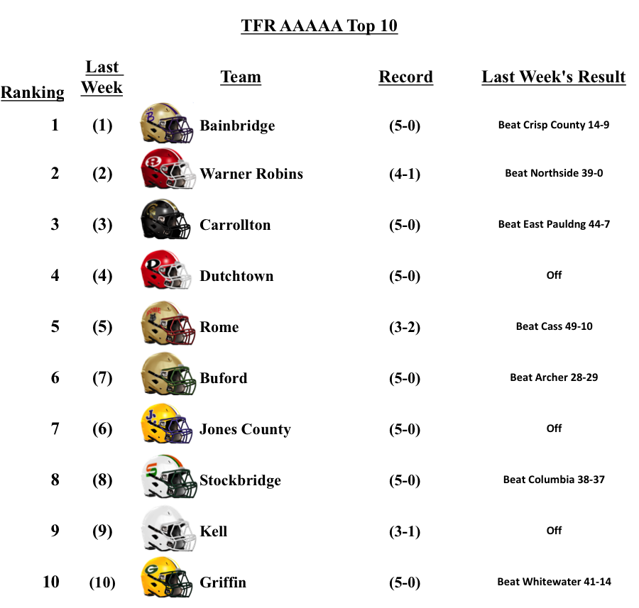 Week-6 brought us more big games across the state of Georgia. In perhaps the biggest matchup in 7A, Colquitt County beat Grayson. Grayson was our previous No. 1 drops to No. 4. Lowndes is the new No. 1 as they blanked Valdosta in the Winnersville Classic. In another battle of Top-10 teams, Parkview topped Milton in a defensive battle. The loss dropped Milton out of the poll while North Gwinnett makes their first appearance in the poll at No. 9, and Archer rounds out the Top-10 after an overtime defeat at the hands of Class 5A Buford.