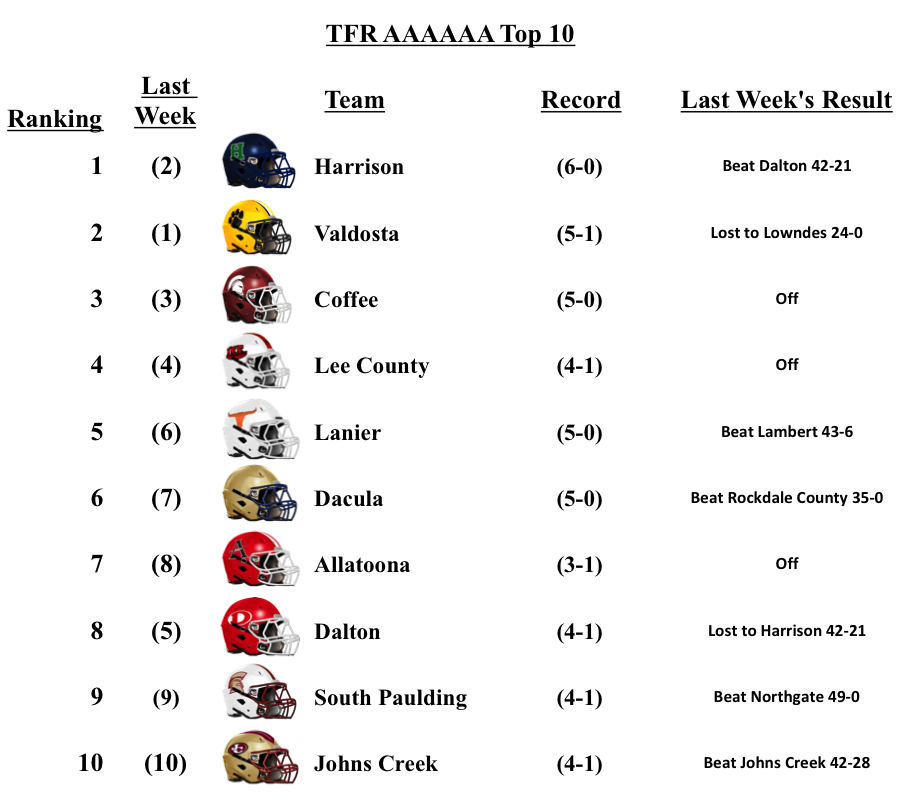 In 6A, Harrison defeated Dalton to take over the No. 1 position in the poll. Valdosta dropped one spot to No. 2 after their loss to Lowndes. The only change to the 5A poll was Buford moving up one spot after defeating Archer. There were no changes in the 4A poll this week.