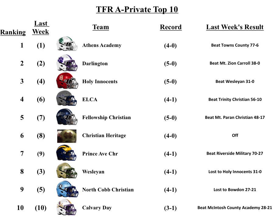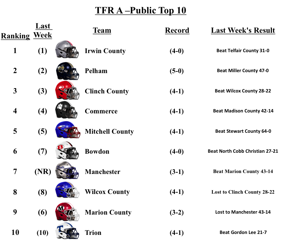 The Top-10 in Class 2A remains unchanged. Class A-Public had some shake up. Manchester jumps back into the poll at No. 7 after a big win over Marion County. Claxton who was ranked No. 10 drops out of the poll this week although they were on bye. Class A-Private saw North Cobb Christian fall to Bowdon and Holy Innocents put their stamp on Region 5 with a shutout win over Wesleyan. The losses drop Wesleyan to No. 8 and North Cobb Christian to No. 9.