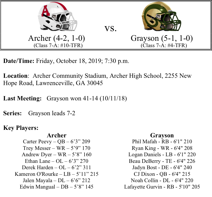 The Grayson Rams bounced back from their first loss of the season last Thursday with a big win over Shiloh. The Rams are averaging 29.1 points per game. C.J. Dixon has passed for 1,267 yards and 13-TDs. Lafayette Gurvin Jr. continues to lead the team in rushing in Phil Mafah’s absence with 654 yards and 7-TDs. The Rams are allowing 16.6 points per game on defense. Grayson is 1-1 against ranked teams in 7A this season. While this is a road game for the Rams, we think they get the best of Archer again this season. But it will be a little closer than last year. We like Grayson by a touchdown.