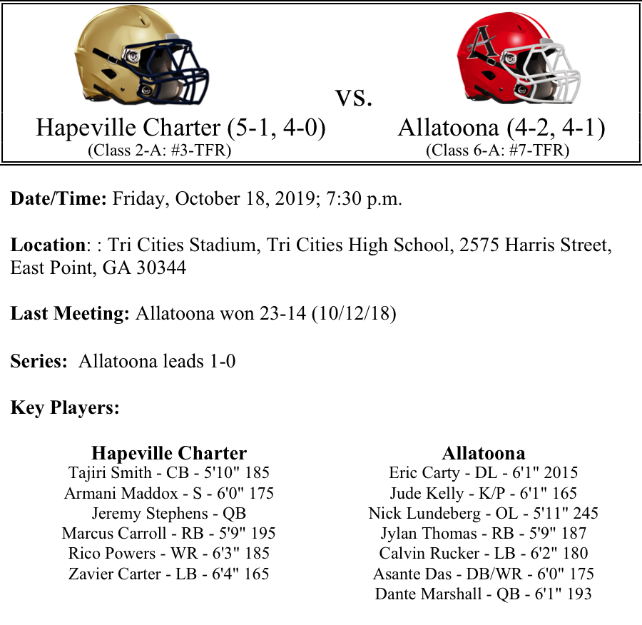 Hapeville Charter and Allatoona will face off in a non-region contest. Both teams are ranked in their respective classes. Hapeville has won five straight games since their Week-1 loss to Cedar Grove. In their five wins, the Hornets are outscoring their opponents 261-26. The offense is averaging 46.1 points per game, while the defense is allowing 8.6 points this season. Marcus Powell leads the team in rushing with 623 yards and 10-TDs while Nae’Sean Dickerson and Rico Powers Jr. have combined for 23 receptions 520 yards and 5 receiving TDs.