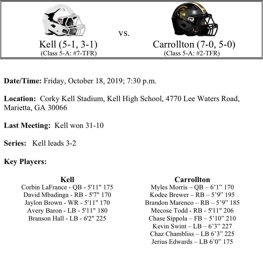 The Carrollton Trojans and Kell Longhorns will meet in a game with significant region standing implications. Kell’s only loss was a one-point defeat to Rome a month ago. The Longhorns defense has been stingy, allowing only 9.6 points per game. They have recorded two shutouts thus far. Offensively, the Longhorns are averaging 31.5 points per game. Talented Freshman David Mbadinga leads the way for the Longhorns in rushing.