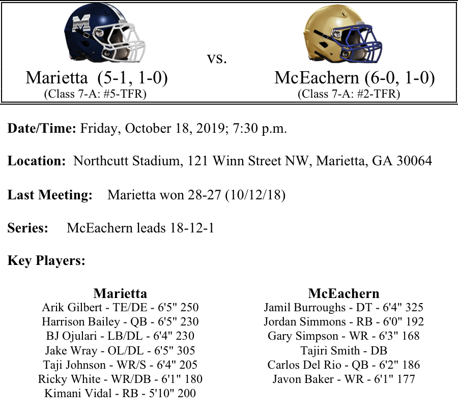 The Marietta Blue Devils and McEachern Indians will face off in a big Region 3-7A matchup. If Marietta is going to win their first region title since 2005, they will need a strong showing this Friday from Harrison Bailey. They senior quarterback has passed for 1,817 yards and 18-TDs. The Blue Devils are a pass heavy offense, but Kimani Vidal has rushed for 545 yards and 8-TDs. The Blue Devils are averaging 33.1 points per game on offense while the defense is allowing 18.8 points per game. B.J. Oujulari has recorded 10 sacks for the Marietta defense.