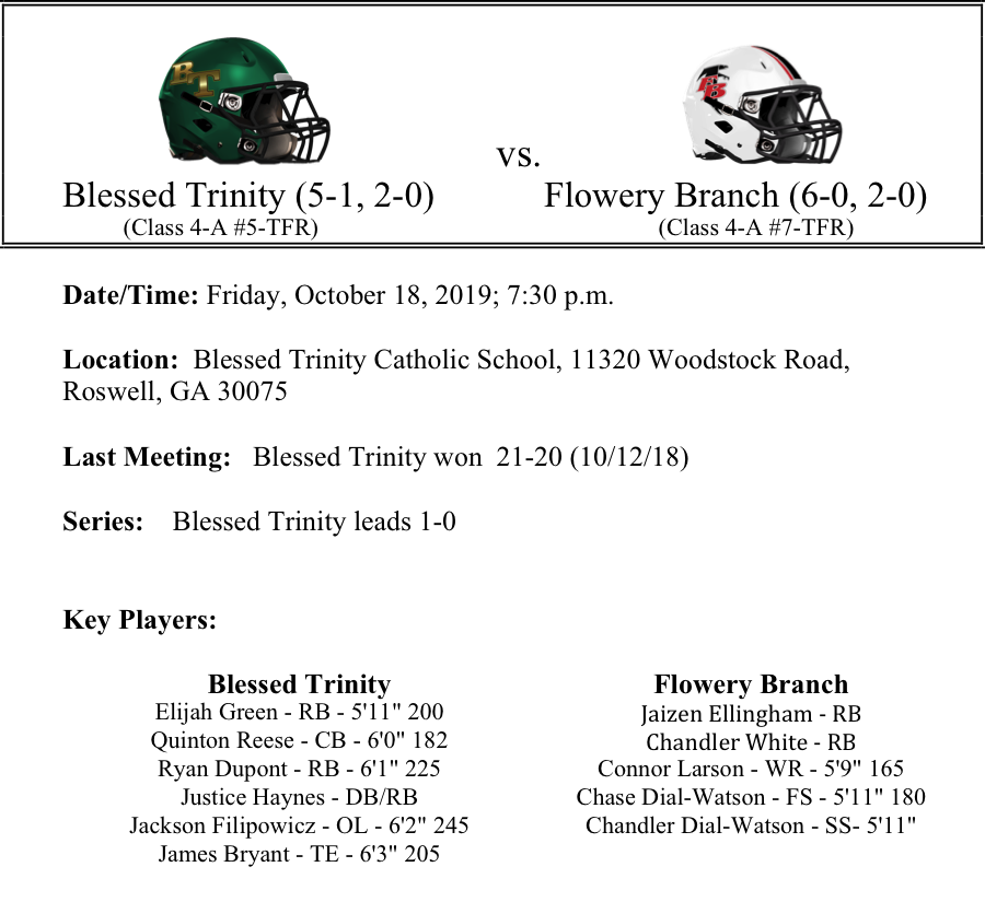 The Blessed Trinity Titans will host the Flowery Branch Titans this week. The Titans edged region foe Denmark last week and have another tough test this week. The Titans have a potent one-two punch at running back with a healthy Elijah Green and talented freshman Justice Haynes. The Blessed Trinity defense is allowing 14.3 points per game, while their offense is averaging 26.3 points per game. Defensive end Grayson Gilder made a living last week wreaking havoc in the Denmark backfield.