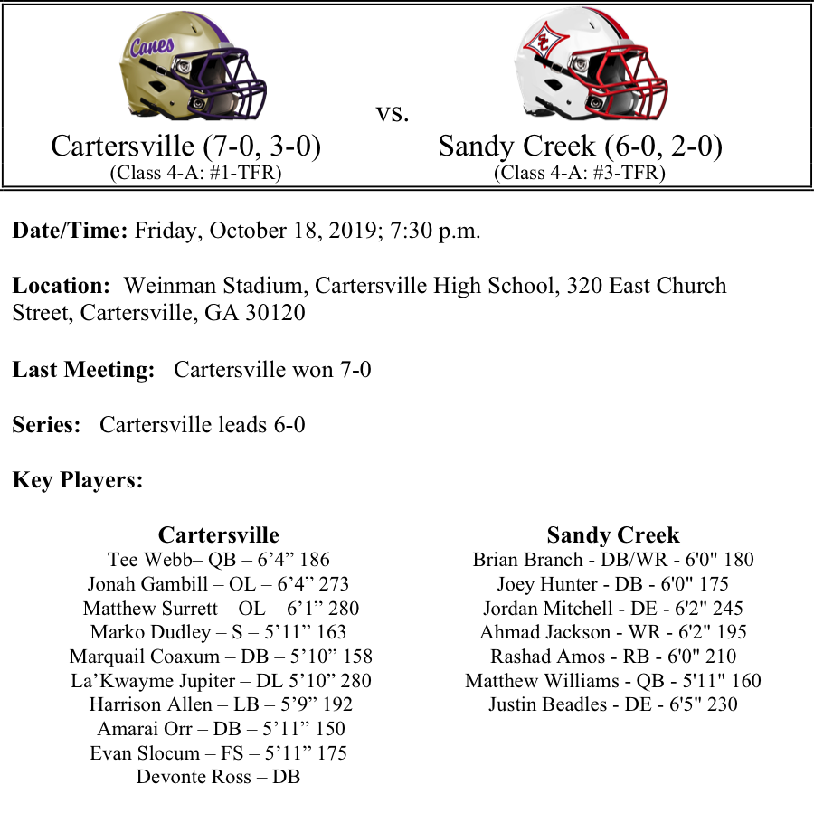This might be the defect Region Title game as two of the top teams in Class 4A face off at Weinman Stadium as the Sandy Creek Patriots visit the Cartersville Purple Hurricanes. Cartersville features one of the best defenses in Class 4A as the Purple Hurricanes are allowing only 5.4 points per game. They have two shutouts and have also held two other teams to just 2 points. Offensively, Tee Webb powers a unit that averages 32.1 points per game. Webb has passed for 1,358 yards and 14-TDs. The Canes have rushed for 890 yards on the season. Devonta Ross leads the team in receiving with 22 receptions for 525 yards and 5-TDs.