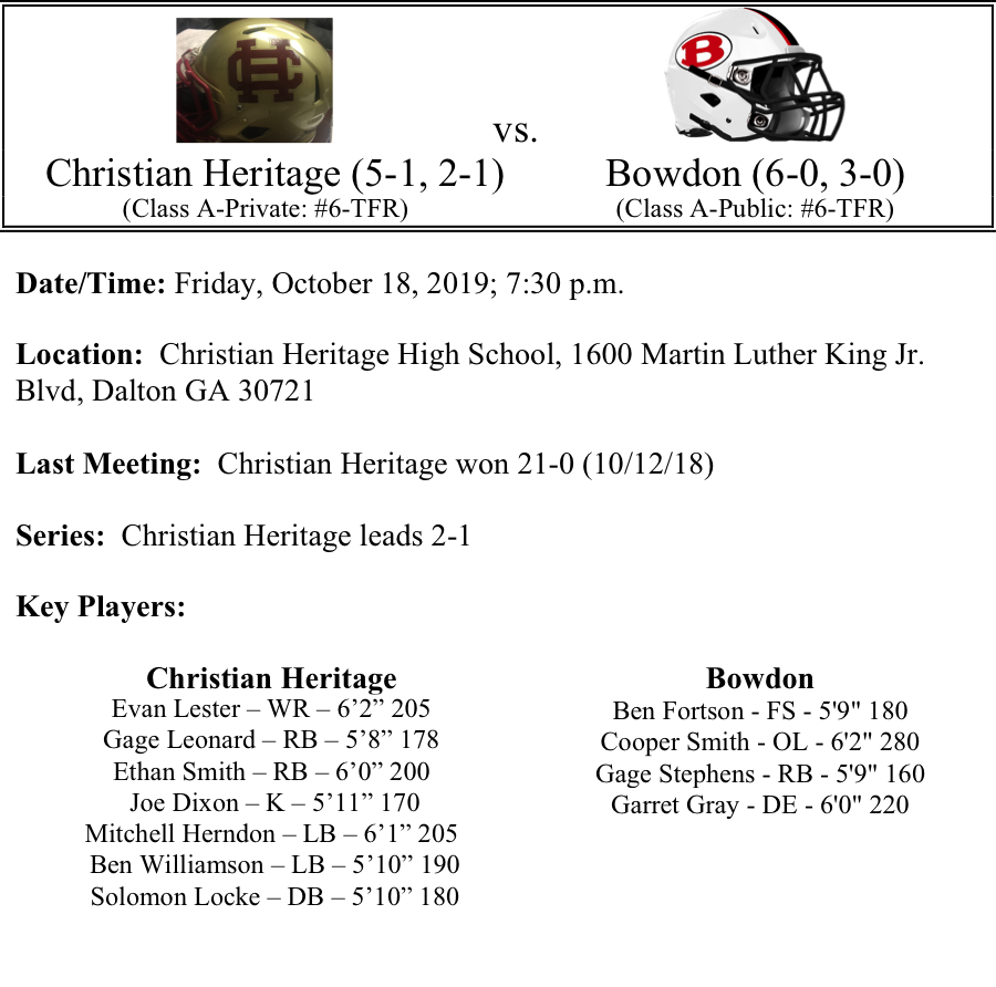 The Christian Heritage Lions will host the Bowdon Red Devils this week in a Region-6 Single A matchup. The only blemish on the Lions record is a 7-point loss to Darlington. Otherwise the Lions have been pretty darn good. The defense is allowing 9.1 points per game, while the offense is averaging 34 points per game. Gage Leonard leads the team in rushing with 494 yards while Ethan Smith has run for 384 yards. Christian Thomas has passed fro 881 yards and 9-TDs. Ben Hermann and Solomon Locke lead the defense in tackles.