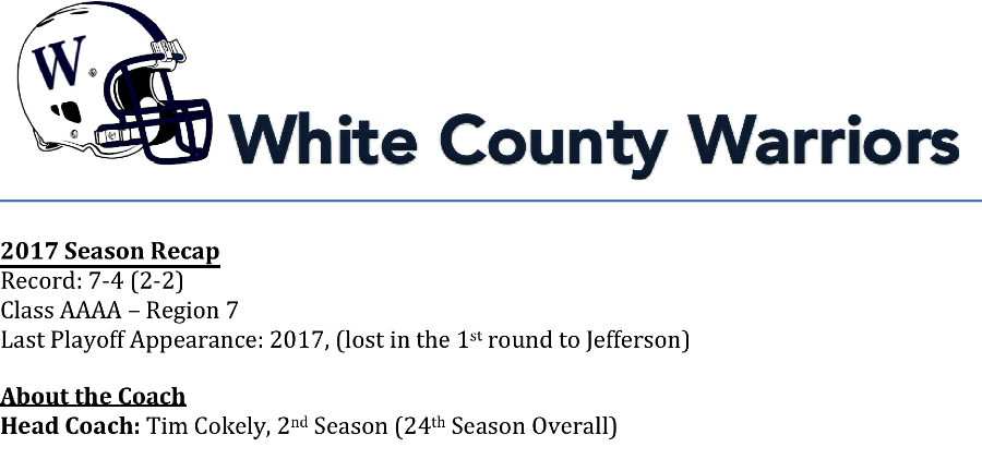 Coach Tim Cokely leads enters his second season at the helm for the White County Warriors. The Warriors had a reversal of fortunes in Cokely’s first season and returned the playoffs for the first time in four seasons. However, with a new season comes new challenges.