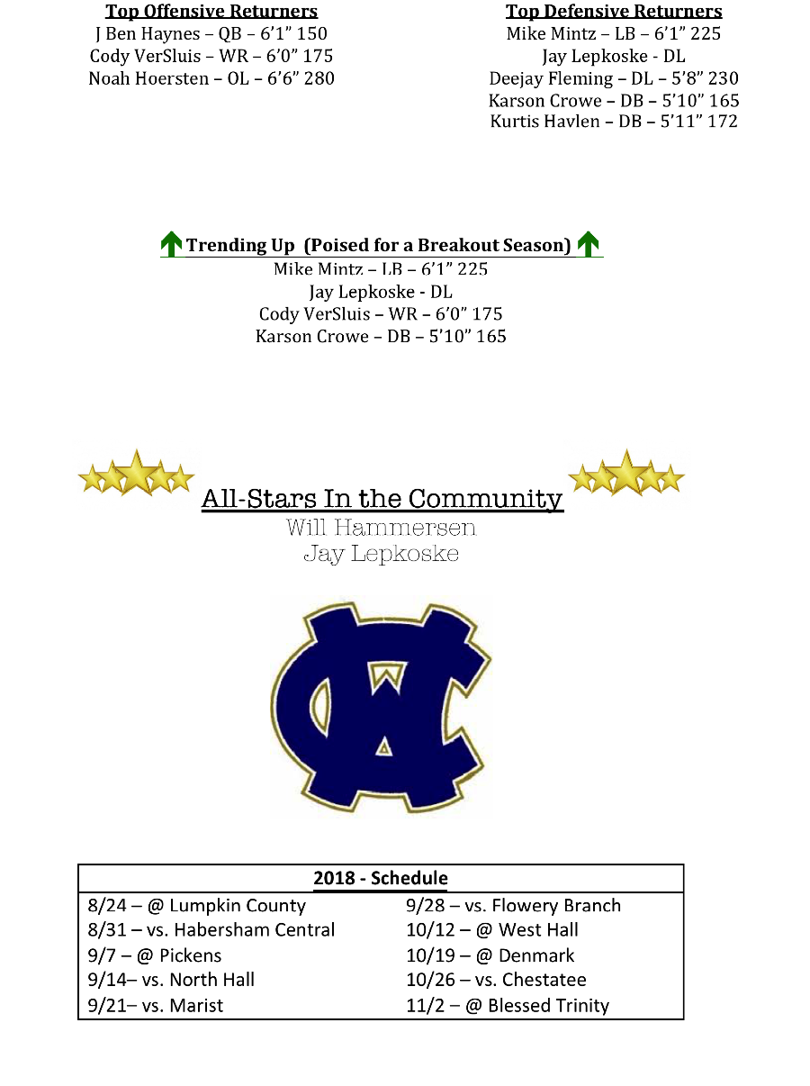Cody VerSluis is projected as one of the leading receivers for the Warriors. While Noah Hoersten is slated to help anchor the offensive line for Coach Cokely.
